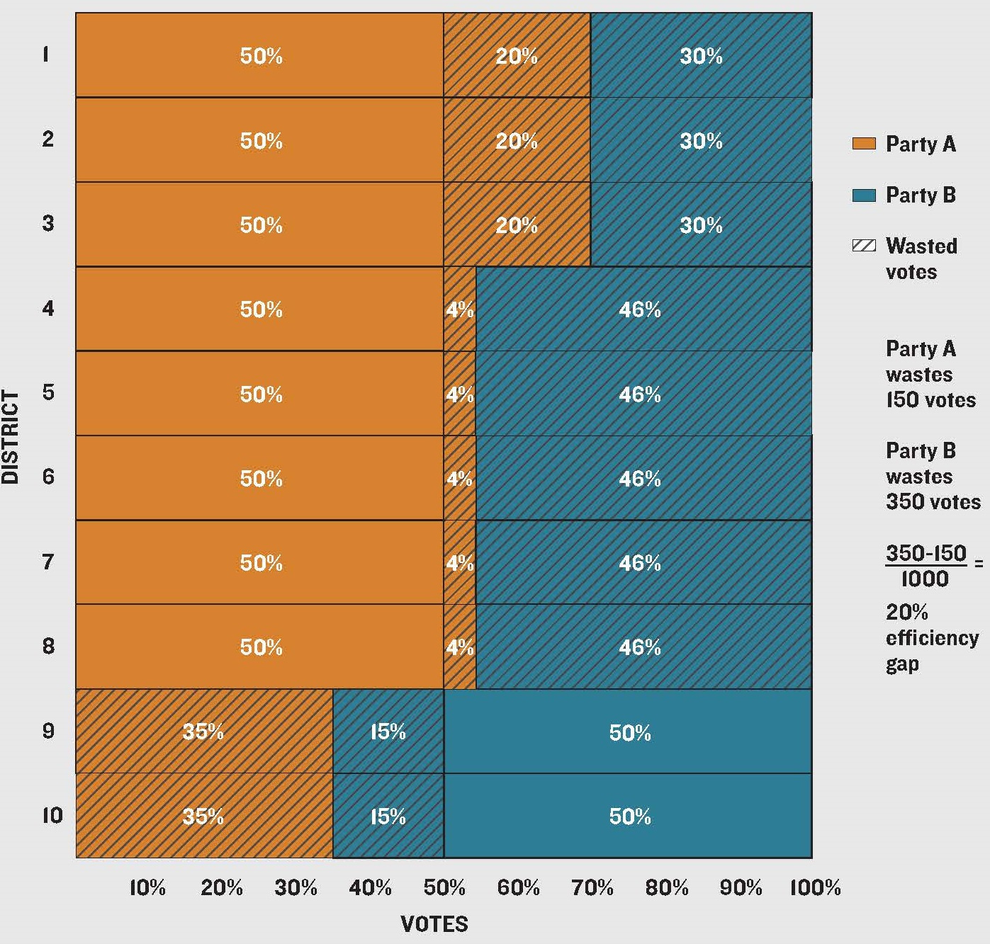 Here is how the math works. Take a county with 10 districts and 1,000 total votes. Republicans win 8 districts, Democrats win 2. When you add up every wasted vote, Democrats wasted 350 while Republicans wasted only 150.