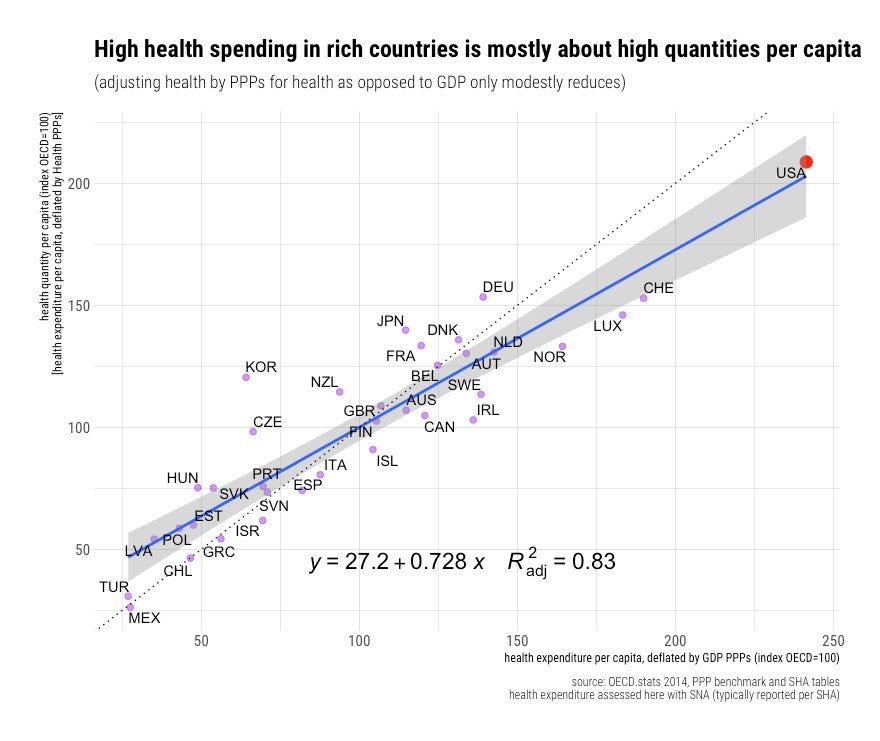 Our prices are indeed higher than in other nations, but that is mostly because we are richer. Any sector which is very labor intensive in a growing economy will inevitably experience the Baumol effect or, as it's often referred to, cost disease. Cost disease occurs as productivity gains in some sectors cause wage growth in others, even when those others have made no productivity gains. This effect leads to inevitable increases in the price level of medical services so long as healthcare maintains its high labor-intensive status.
