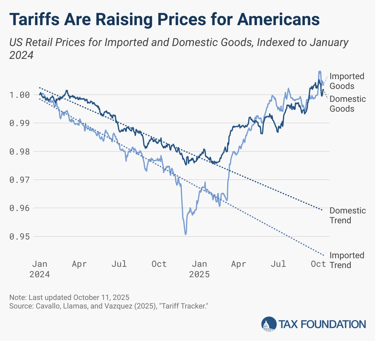 Some sophisticated right-wing commentators have tried to skirt this basic reality by claiming that while U.S. companies technically pay tariffs, the costs are ultimately reimbursed by foreign exporters through lower prices or side payments. But the data tells a different story. The Bureau of Labor Statistics’ Import Price Index, which tracks the base price of imported goods, has not fallen to offset the new tariffs. In fact, it has slightly risen. That means foreign exporters aren’t “eating” the cost—Americans are.